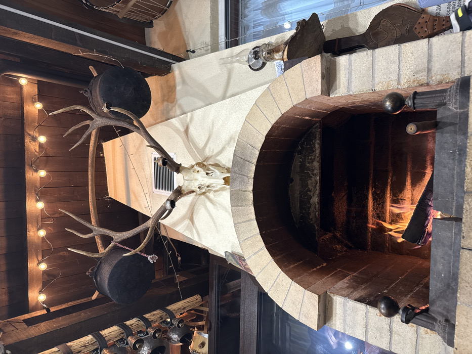 This image displays an interior scene within a traditional establishment located in Razlog, Bulgaria. The central feature is a substantial brick fireplace with an active fire. The fireplace features a light-colored brick arch spanning approximately 1.5 meters. Within the firebox, multiple logs are burning, producing visible orange and yellow flames. Two dark metal fire dogs with spherical finials are positioned at the front of the hearth. Above the fireplace arch, a deer skull with a large, multi-tined antler rack is mounted directly onto a light-colored, textured wall. Directly above the skull, a white rectangular ventilation grille is installed in the wall. The ceiling is constructed from dark wooden beams, across which a string of exposed-bulb lights is suspended, providing ambient illumination. Two dark, cast-iron cauldrons are suspended from the wooden beams, positioned above and to the left and right of the deer antlers. A decorative pink cord with an attached ornament hangs from the left cauldron. To the immediate left of the fireplace, a vertical wooden element is decorated with multiple metal bells of varying sizes. To the right of the fireplace, an oil lamp with a glass chimney is mounted on the wall. Below the lamp, a large, ornate wooden bellows with a dark leather body and studded accents hangs vertically. A window with light-colored curtains is partially visible in the far-right background, along with an indistinct sign bearing Cyrillic text. No individuals are depicted in the scene.