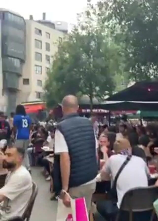 Here is a detailed description of the video: The video shows a crowded outdoor area with many people seated at tables under red awnings, suggesting a cafe or restaurant. The camera pans across the scene, focusing on different individuals and groups. There are several men and women visible, engaged in conversations or simply relaxing. Several people are walking through the crowded space. In the foreground, a man wearing a black vest and carrying a pink shopping bag is walking to the left. Another man with visible tattoos on his arm is walking in the opposite direction. In the background, a man wearing a blue jersey with the number 3 on the back is walking. The surroundings include trees and buildings, indicating that the setting is likely an urban outdoor area. The overall atmosphere seems relaxed and social.