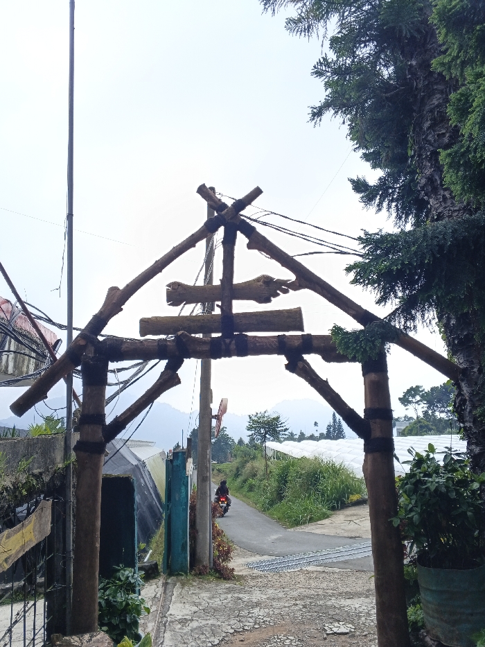 This scene is located in Uato Carabar, Timor-Leste, under an overcast sky. The foreground features a rustic archway constructed from dark, irregularly shaped wooden branches, secured with dark bindings. This archway frames a view of a narrow, asphalt road receding into the mid-ground. To the left of the archway, a tall, slender utility pole stands, and a portion of a metal gate is visible. Immediately left of the asphalt road, a turquoise-colored vertical panel or gate section is present. One individual, wearing dark clothing and a helmet, is operating a red motorcycle, driving away from the viewer on the paved road. To the right of the road, several large, white, dome-shaped structures, indicative of greenhouses, are visible. Green vegetation, including dense foliage from a tall evergreen tree on the far right and smaller plants along the roadside, populates the environment. Distant mountains or hills are faintly visible in the background, partially obscured by a hazy sky. A green barrel or planter containing plants is situated on the far right, at the base of the archway. The ground in the immediate foreground consists of cracked, light-colored pavement.