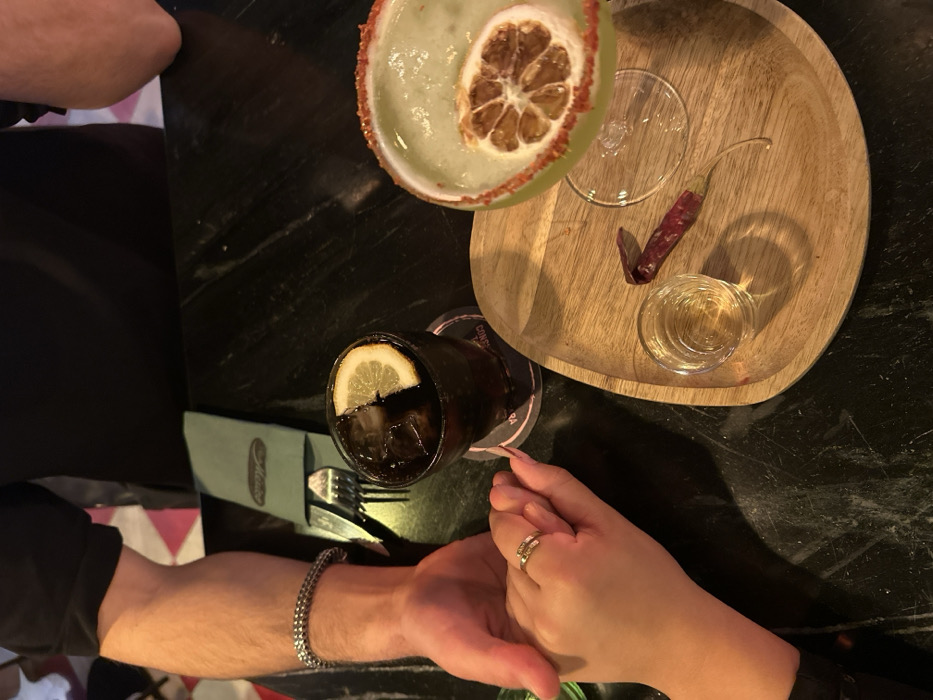 Two individuals are seated opposite each other at a dark, veined marble table, holding hands. The person on the left, identified by a forearm wearing a silver chain-link bracelet and a black short-sleeved top, holds the left hand of the second person. The second person, wearing two gold-colored rings on the left ring finger and a dark long-sleeved top, holds the first person's hand. On the table, a tall glass containing a dark carbonated beverage with ice and a lemon slice rests on a coaster partially visible with "CONTRABANDO COCKTAIL BAR" printed on it. To the right, a margarita glass holds a light green, slushy-like cocktail with a red-orange spiced rim, garnished with a dried citrus wheel. This glass sits on a small, light-colored wooden tray, which also holds a clear shot glass containing an amber liquid and a single dried red chili pepper. A folded dark green napkin with an indistinct logo, containing a silver fork and knife, is positioned to the left of the dark beverage. The background is dimly lit and out of focus, showing a blurred pattern of light and dark pink/red tiles. The scene takes place at Contrabando Cocktail Bar in Alicante/Alacant, Spain.