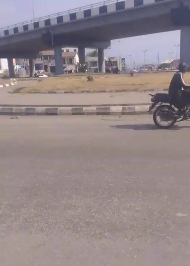 street scene with an overpass in the background. A person is riding a motorcycle along the road. The perspective then shifts to a view from within a vehicle, possibly a type of auto rickshaw, showing other vehicles and pedestrians at an intersection. The view is partially obstructed by the vehicle's frame. The day appears to be sunny.