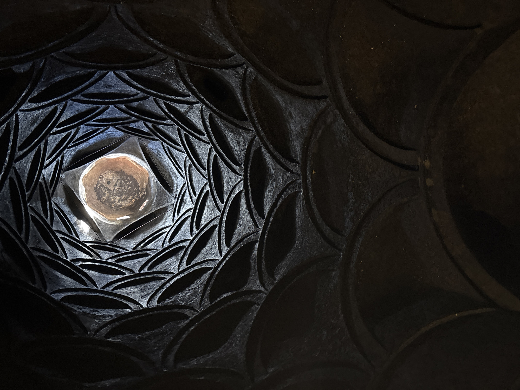 View looking up the inside of a dark, cylindrical structure. The walls are covered in a repeating pattern of oval-shaped depressions, arranged in a concentric, spiraling design. Light is visible at the top of the structure, shining into the interior, illuminating the surfaces closest to the opening. The materials appear to be stone or a similar heavy material. Based on the information provided, the location is Rilski manastir, Bulgaria.