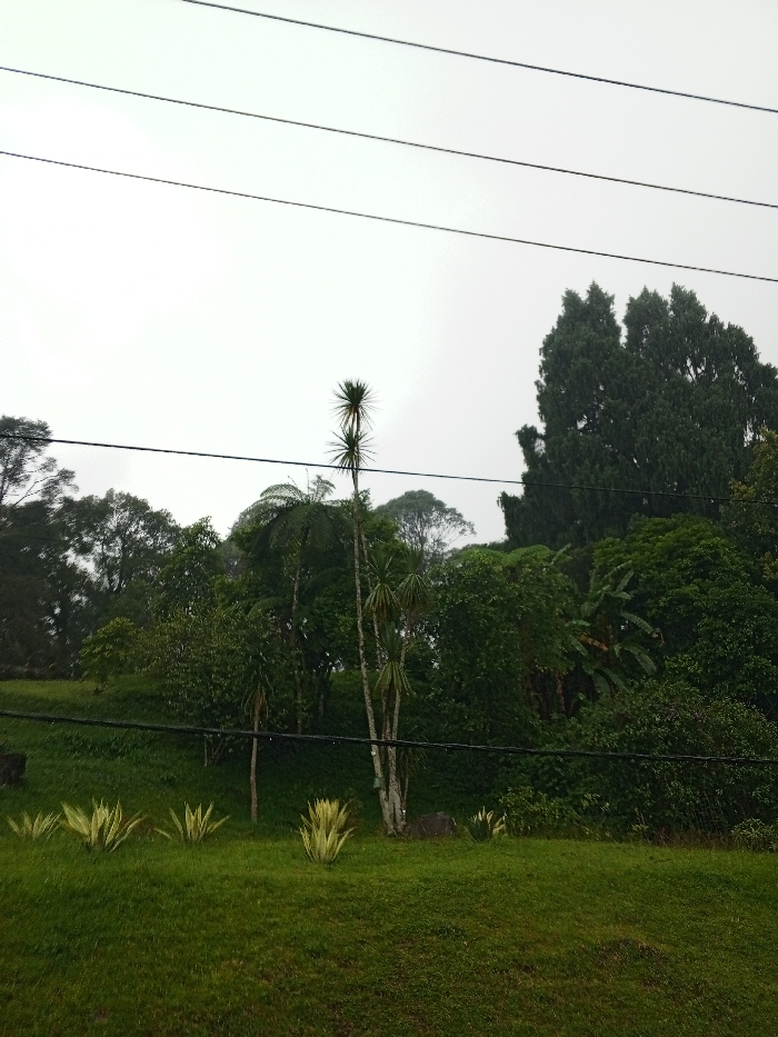 A lush green landscape under a cloudy sky features tall trees and dense foliage. Power lines cut across the view. Yellow-green plants dot the grassy foreground. A cluster of slender, palm-like trees with tufted tops rises slightly above the other vegetation. The scene evokes a sense of natural beauty and serenity, despite the obscured sunlight.