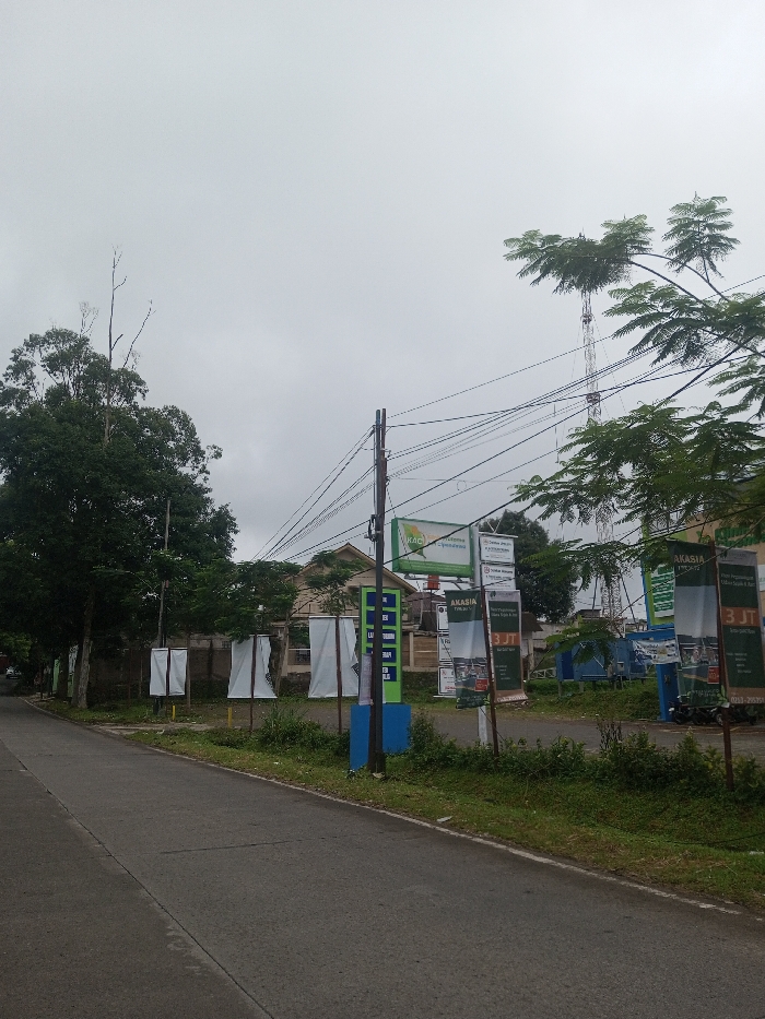 The scene depicts an outdoor urban or semi-urban environment under an overcast, grey sky. A paved asphalt road, without visible lane markings, extends from the lower left towards the mid-left of the image. To the right of the road, a grassy verge is present. Along this verge, a row of large trees with dark green foliage lines the left side, some exhibiting bare branches near their tops. Further to the right, several vertical white banners or flags, some partially furled or damaged, are erected on poles. In the mid-ground, a dark utility pole with a blue base stands prominently, heavily laden with numerous black electrical and communication wires extending in various directions. Adjacent to this pole and extending to the right, a cluster of advertising signs is visible. These include a green rectangular billboard-style sign displaying "AKASIA" and "Cipendawa", alongside multiple vertical banners also featuring "AKASIA" and "3 JT" (likely "3 Juta"). The language on these signs suggests an Indonesian context rather than Sri Lankan. Behind these signs, a light-colored building with a brown roof is partially visible. Further back and to the right, several blue structures or containers are present. A dark-colored scooter or motorcycle is partially visible behind the rightmost banners. In the background, a tall, metal lattice communication tower stands against the grey sky, rising above the surrounding trees and structures. No individuals are present, and no specific actions are occurring within the frame. The location, based on the textual evidence ("AKASIA", "Cipendawa", "3 JT") on the visible signage, indicates a setting in Indonesia, which contradicts the specified city of Eheliyagoda, Sri Lanka.