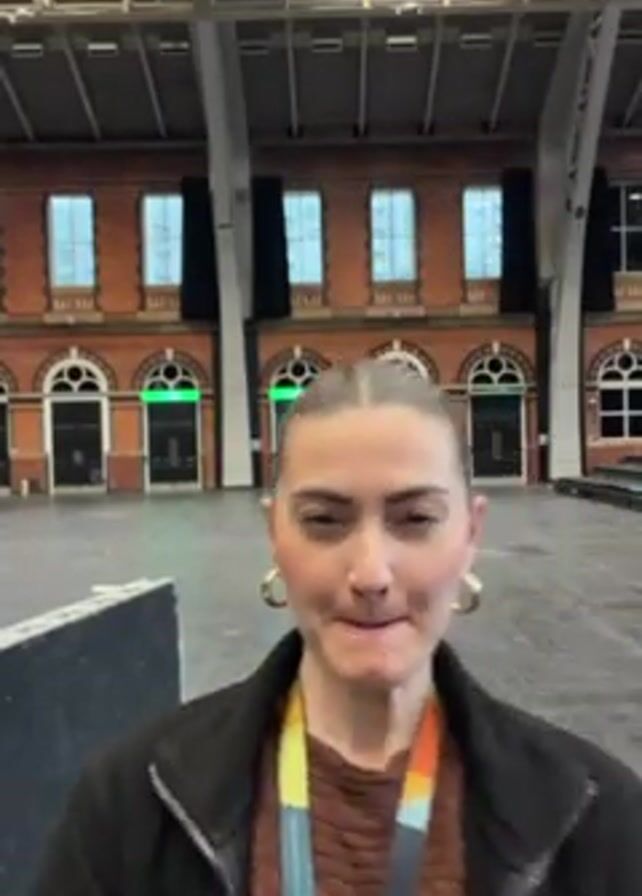 The video features a person holding two power drills in front of them in an indoor setting. The person is holding a black and red drill in their left hand, and a yellow and black drill in their right hand. Both drills are turned on, and their lights are illuminated, pointing towards the camera. The person is smiling and looking directly at the camera. They are wearing a dark coat, a patterned shirt, and large gold hoop earrings. Behind the person is a large open space with a high ceiling, metal beams, and brick buildings visible through windows. The floor appears to be made of dark tile. There is a dark object visible to the left.