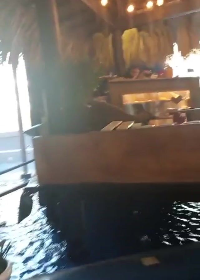 The video begins inside a tiki-style structure with a thatched roof, illuminated by string lights