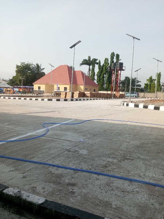 A building with a red roof and yellow walls stands near a paved area marked with black and white borders. Solar-powered street lights illuminate the scene. A metal water tower with black tanks is visible behind the building, next to tall, thin trees. A blue hose lies across the pavement in the foreground. A parked car is partially visible behind the water tower. Stacks of bricks are located next to the building.