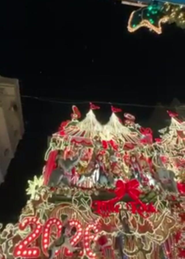 The video depicts a building adorned with elaborate Christmas lights and decorations. The decorations are primarily red and white, featuring a circus theme with tent-like structures on top. The year 2024 is displayed prominently with illuminated numerals. There are also figures resembling circus performers. Below the decorations, a crowd of people is visible. The scene is at night, and the lights stand out against the dark sky. There are additional Christmas lights draped along the street.