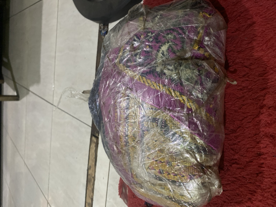 A bundle of patterned fabric wrapped in clear plastic sits on a surface. The fabric features a mix of colors including purple, gold, and black. The surface is tiled in white with a red, textured material visible near the wrapped bundle. Parts of a metal structure and a dark object, possibly a wheel, are visible in the background. The overall presentation suggests an item packaged for storage or transport.