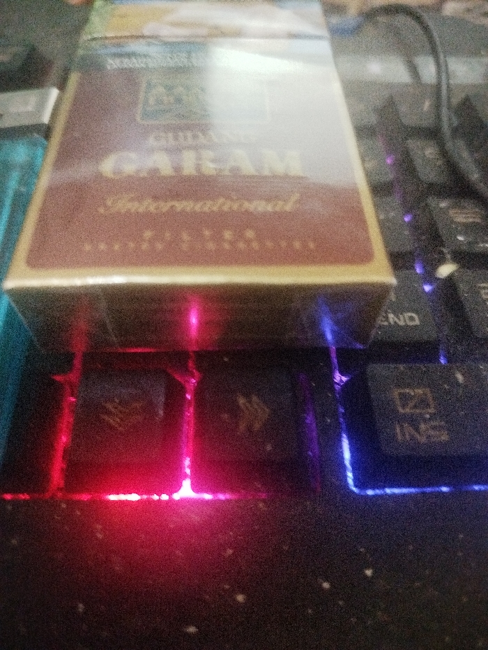 A pack of Gudang Garam International cigarettes sits on a black keyboard with glowing red and purple lights