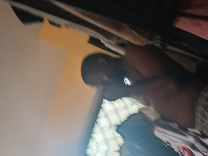 man sitting shirtless in a dimly lit room. He appears to be holding something in his right hand. The man's face is blurred. There is another person to the left of the man, obscured by the shadows. The image was taken in Kajola, Nigeria at the coordinates (latitude: 7.518, longitude: 4.515). The room is cluttered with household items, and there is a window in the background.