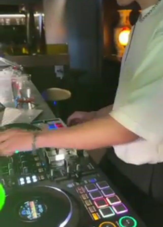 A young DJ wearing a white t-shirt, black pants, glasses, and a silver chain is using a DJ controller behind a bar