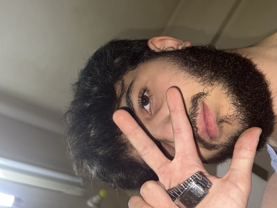 A low-angle shot captures a person with dark curly hair and a full beard. They hold their hand up, fingers forming a peace sign. A large, ornate ring adorns their finger. The person's eye is visible, and they appear to be looking at the camera. The background shows a plain ceiling. The overall composition feels casual and close-up.