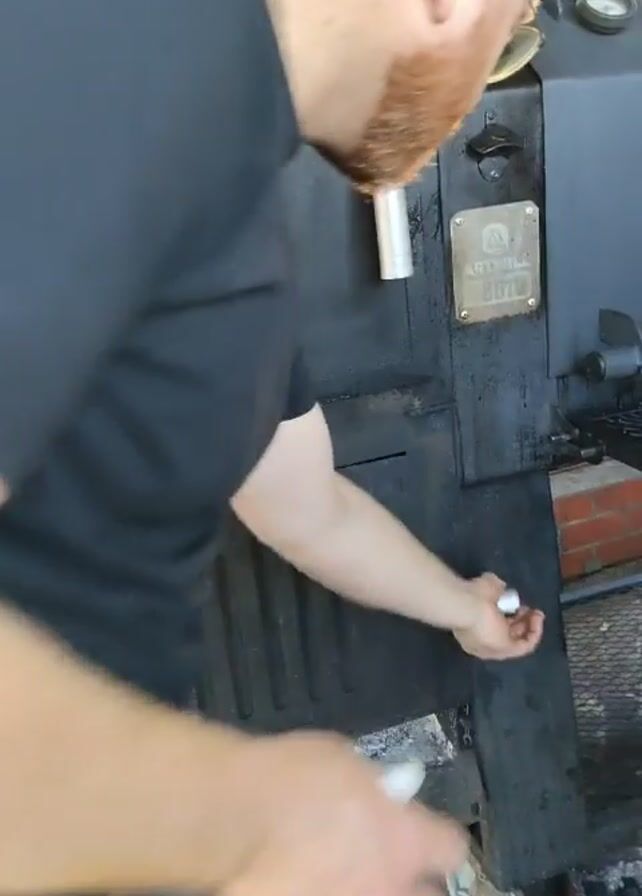 - "A person is shown opening the door to the firebox of a large black smoker grill" by FM-xkd7v1, licensed under CC BY 4.0