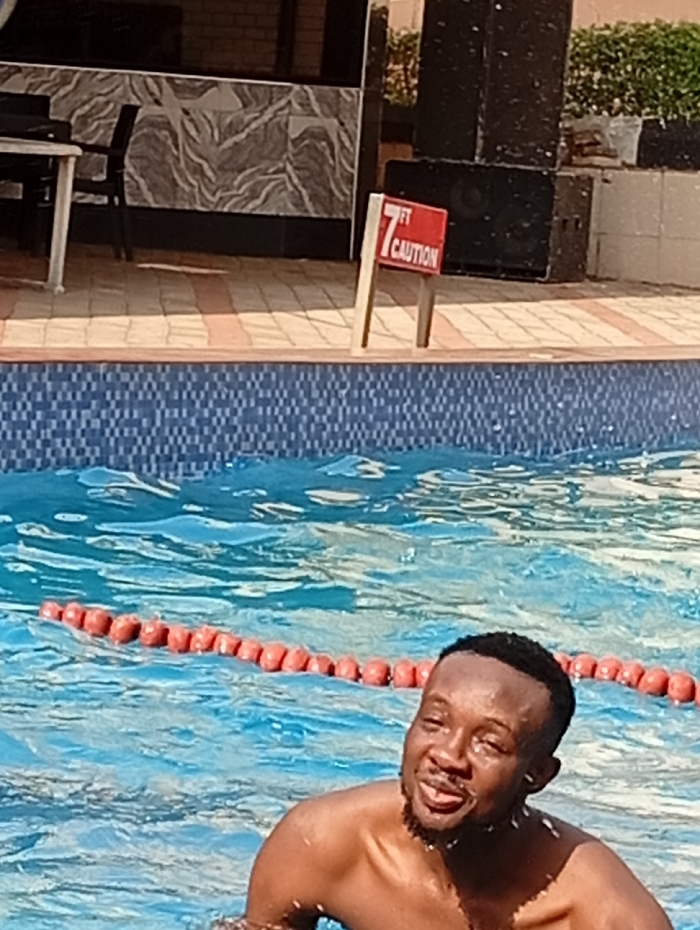 A man is submerged in a swimming pool, with his shoulders and head above the water. He has dark skin, short dark hair, and a trimmed beard. The man has a small smile on his face with his tongue slightly out. In the background, a row of red buoys stretches across the pool and a sign with the words "7 FT CAUTION" is visible. Behind the sign, there are some speakers or other equipment. The pool water is slightly rippled, indicating movement.