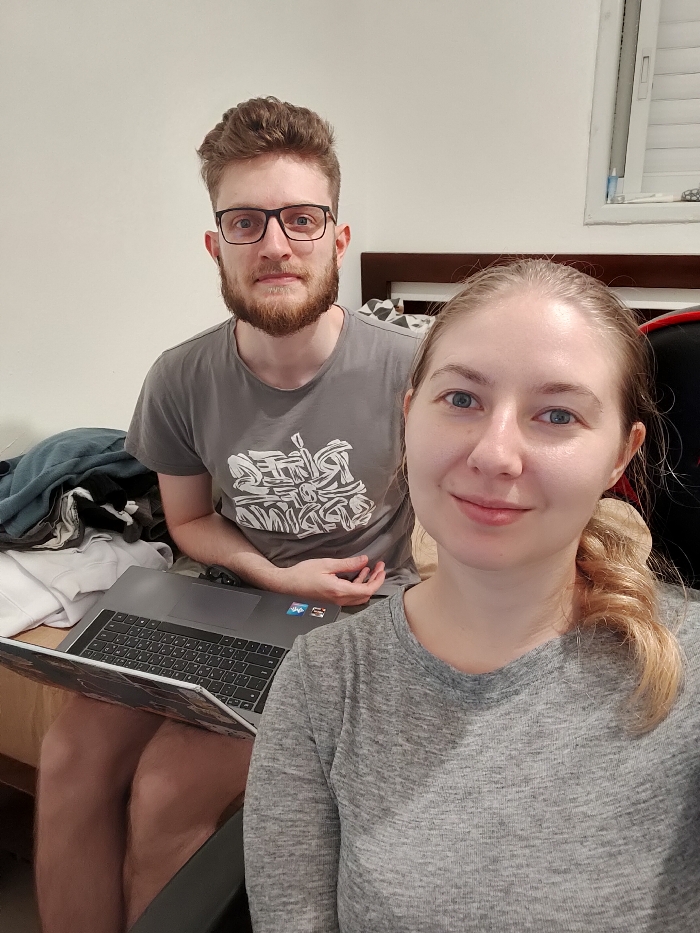 A couple is posing for a selfie indoors. A man with a beard and glasses is behind a woman with blond hair pulled back. He wears a gray t-shirt and holds a laptop. She wears a gray long-sleeved shirt. A bed with clothes is visible behind the man. A headboard and a partially visible red and black chair are also in the background. A window with closed blinds is in the upper right corner.
