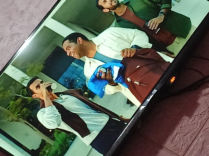 A flat-screen TV displays a scene with three men. One man is drinking from a white cup, wearing a white shirt and a brown sweater. Another man stands next to him, smiling, wearing a white shirt over a blue undershirt. He holds a folded blue garment. The third man is visible in the background, wearing a green shirt over a brown undershirt and a watch. The background features a bright, outdoor setting.