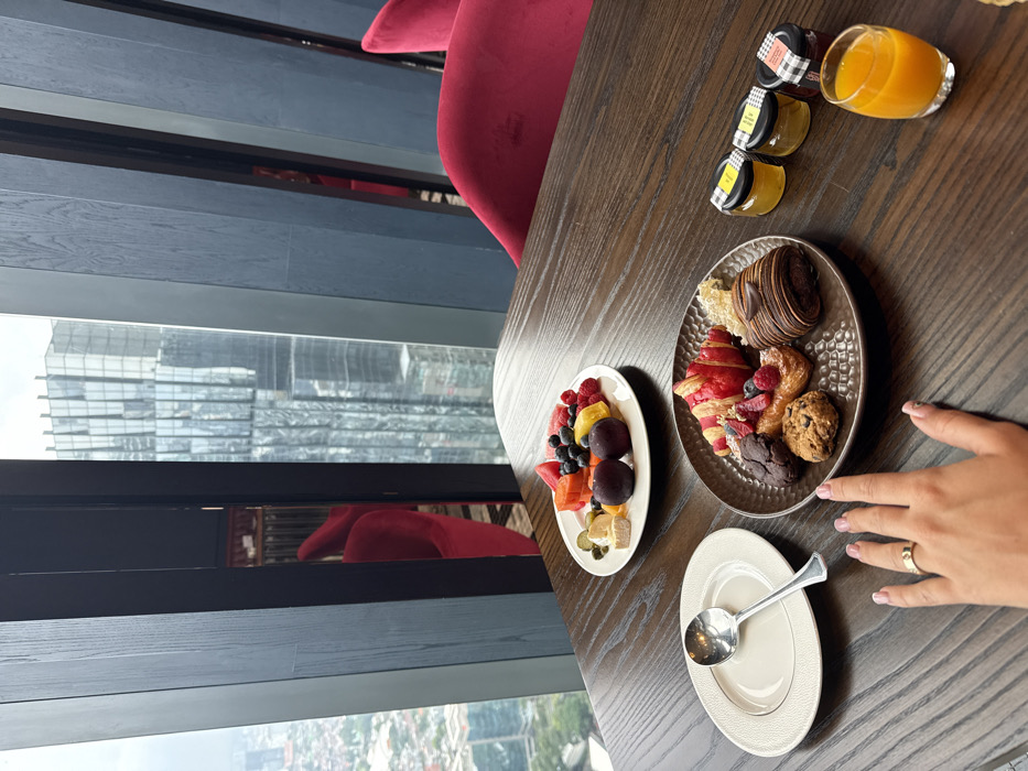 A table displays breakfast items, including a plate of mixed fruits, a plate with pastries and cookies, and a side dish with a spoon. Three small jars and a glass of orange juice sit at the top of the table. A blurred cityscape is visible through a large window next to the table, and the edge of a red chair can be seen behind the table. A hand with a ring is present in the lower right corner.