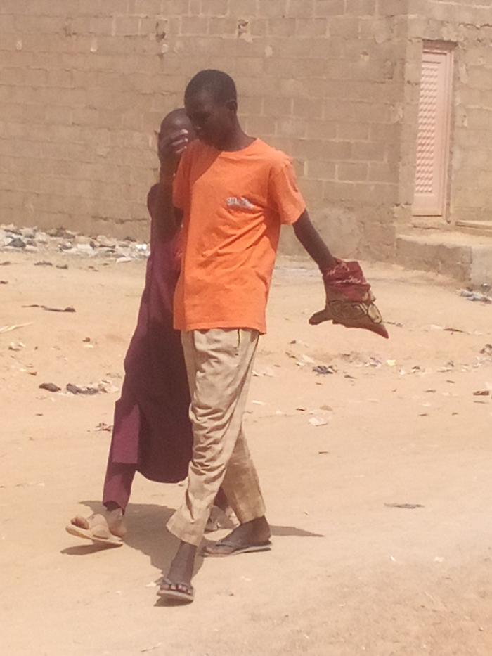 Two individuals are observed walking on a dirt path in Rangaza, Nigeria, under bright sunlight. The subject in the foreground is an individual with dark skin, wearing an orange short-sleeved t-shirt with a light-colored logo, light brown trousers, and dark flip-flops. This individual holds a crumpled, multi-colored cloth object in their left hand and looks downward and slightly to their left. Behind and slightly to the left of the foreground subject is another individual, also with dark skin, dressed in a dark purple full-length garment and light brown sandals. This second individual's right hand covers their face. The environment consists of a light brown, sandy ground with scattered debris, including plastic fragments and dark detritus, visible primarily in the mid-ground. A building constructed of light-colored, possibly sand-colored, cinder blocks or bricks forms the background. A narrow, recessed door, colored light pink or peach with a textured pattern, is visible on the right side of this building. Shadows are distinct, indicating direct overhead illumination.