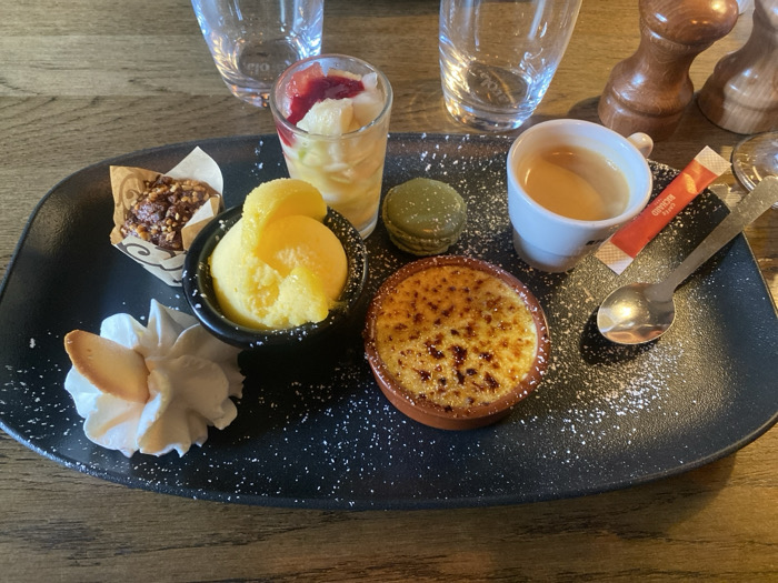 This image displays a dessert selection served on a dark, irregularly shaped platter, resting on a wooden table surface in La Wantzenau, France