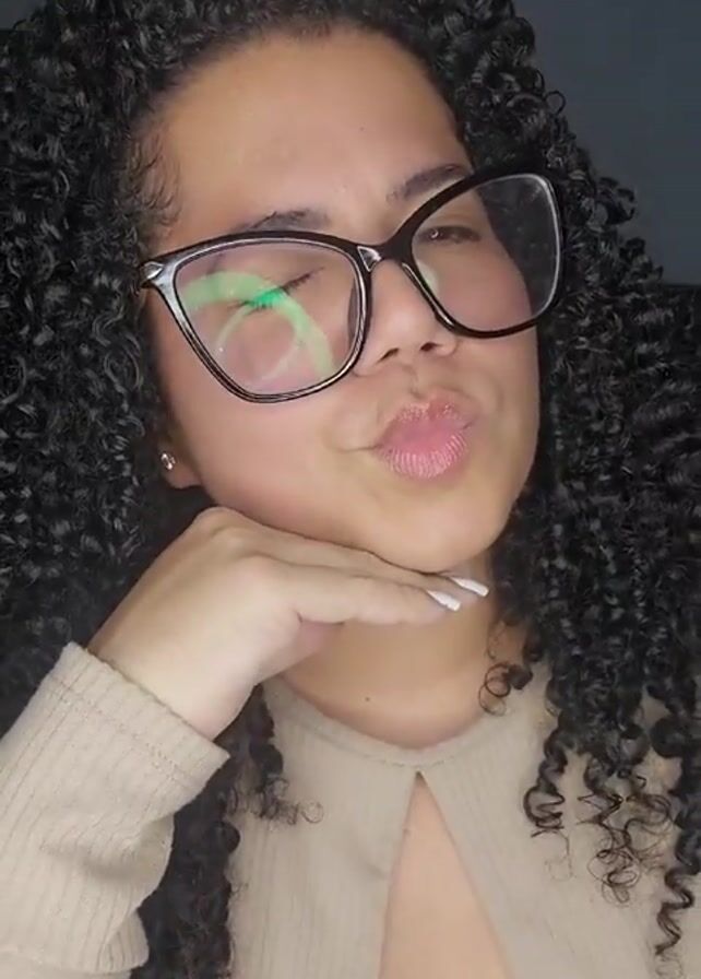 A light-skinned woman with dark, curly hair and glasses is posing for the camera. She is wearing a beige top with a keyhole detail. The woman is puckering her lips, and she has one hand resting on her chin. Her nails are painted white. Behind her is a bed with a black headboard, and a pink plush toy is placed on top of her head. The background is dimly lit.