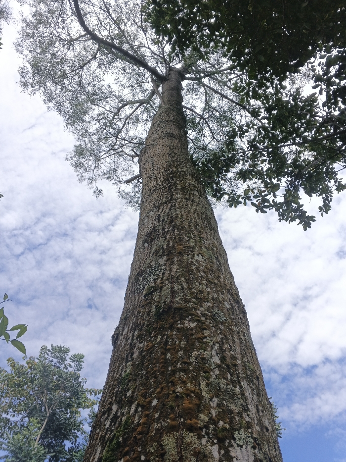A towering tree trunk stretches skyward, its bark textured with moss and lichen. The trunk rises from a cluster of smaller trees at the bottom left corner, blending into the blue and cloudy sky. Up top, branches reach out with leaves that show both densely leaved and thinner, almost bare, branching sections. The canopy is partly obscured by other foliage on the right side.