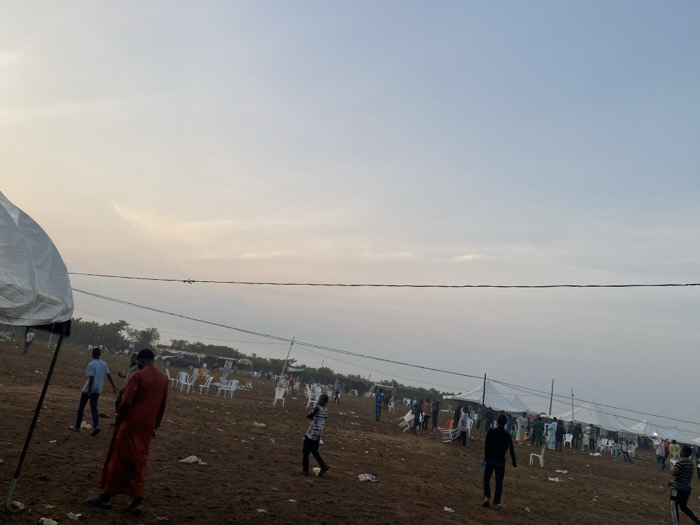 A landscape scene shows a gathering under a muted sky. People stand and stroll across a barren terrain dotted with white chairs and tents. A man in an orange robe walks in the foreground. Overhead, a taut wire cuts across the expansive sky. The scene suggests an outdoor event or celebration in a rural setting.
