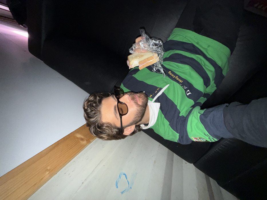 A man wearing sunglasses and a striped green and navy shirt lies on a black couch. He holds a sandwich wrapped in plastic. Part of the wall is visible with a wooden beam near his head. Blue doodles appear on the wall. A light source illuminates the wall behind the couch.