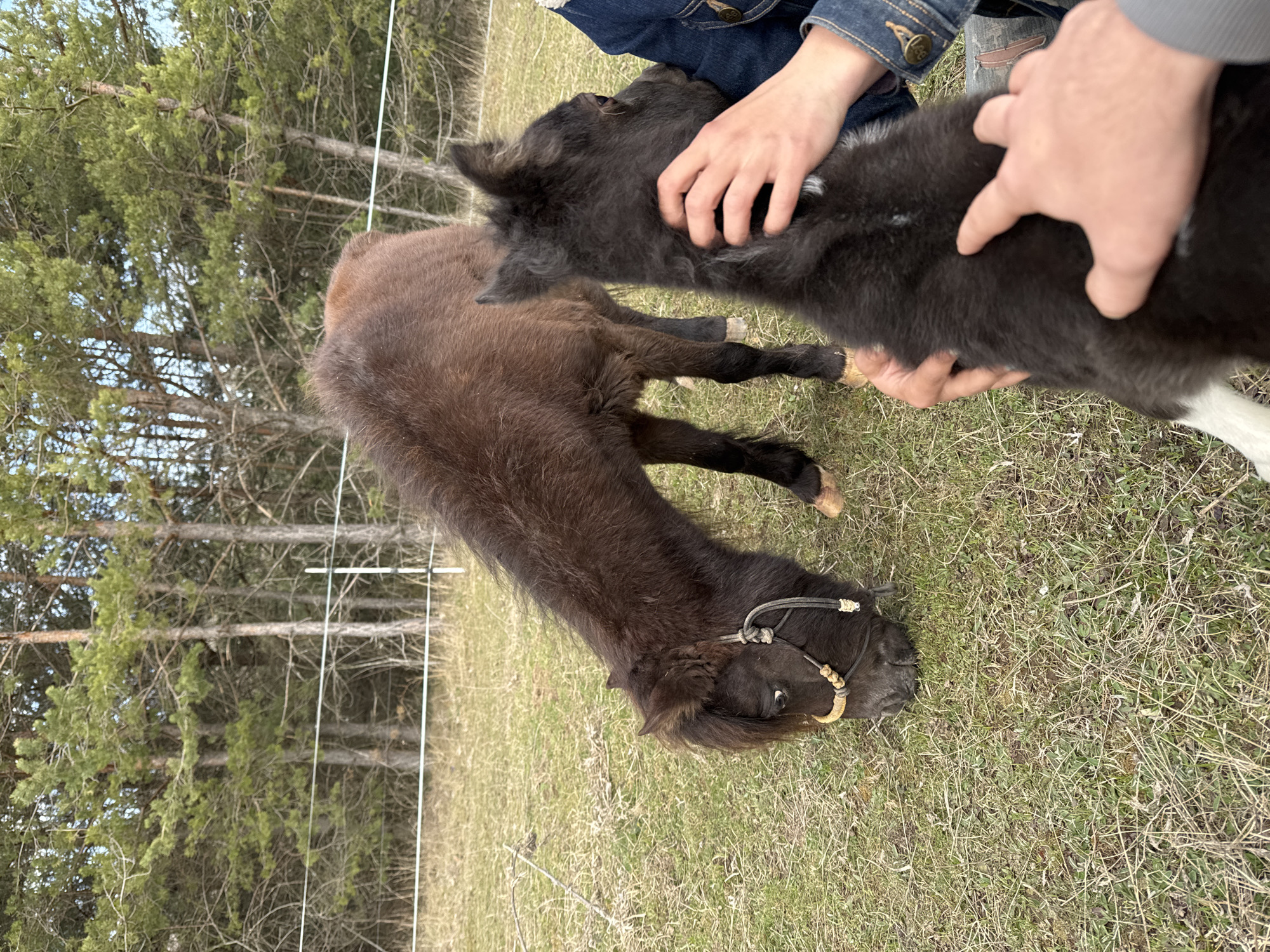two miniature horses in a grassy field near a forest in Kovachevtsi, Bulgaria. One horse, primarily brown, is grazing. The second horse is held and petted by two people, who are partially visible. The horse held by the people is mostly black with some white markings on its legs. The environment includes trees and a wire fence in the background.