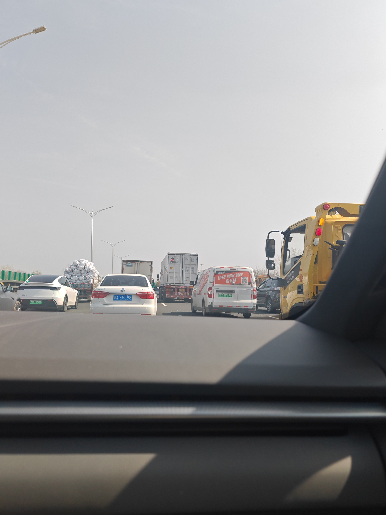 The image displays a multi-lane highway scene in Qinhuai District, Nanjing, Jiangsu Province, China, viewed from within a vehicle. Traffic is congested under a bright, slightly hazy sky. In the leftmost visible lane, a white NIO EC6-style electric vehicle (license plate 苏A AV5616) is positioned behind a white Volkswagen Lavida sedan (license plate 苏A E5L98). Further back in this lane, a truck heavily laden with large white sacks or bales is partially visible. In the adjacent lane to the right, a white delivery van featuring prominent red and white Chinese text on its side (license plate 苏A D19832) is positioned behind a large yellow recovery or utility truck. The yellow truck displays "952995" on its side and has multiple red and amber lights on its rear. Behind the yellow truck, a white semi-trailer truck with "INTER ASIA" and "TRITON" branding on its container is visible (license plate 苏A AP495), followed by a dark-colored SUV and another semi-trailer in the distance. The road environment includes green protective barriers along the left shoulder and multiple overhead street light poles extending into the background. The immediate foreground reveals the dark dashboard and windshield frame of the recording vehicle. No specific individuals are discernible, and all vehicles appear to be stationary or moving slowly in traffic.