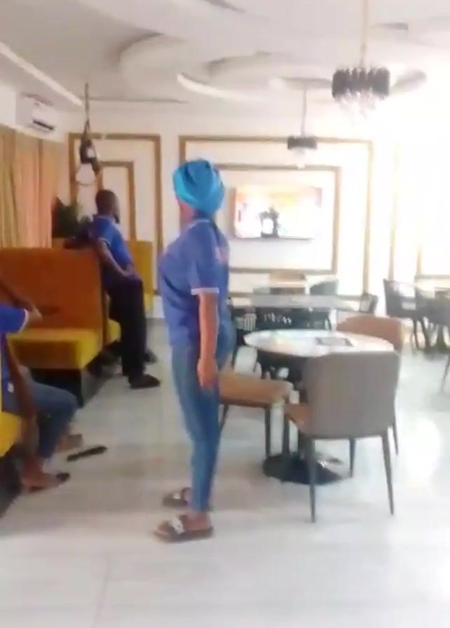 interior of a restaurant or cafe. There are several round tables with chairs, and some booth-style seating along one wall. The floor is tiled, and the ceiling has a decorative design with a chandelier. A flat-screen TV is mounted on the wall. Several people are present, wearing blue shirts. A woman in jeans, sandals, and a blue head covering is standing and talking while gesturing with her hands. Another person is standing near the booth seating. There are others seated at the booth. The room is brightly lit by natural light coming through windows.