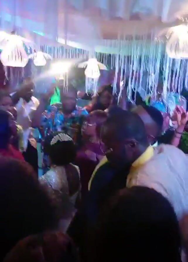 crowd of people at a wedding reception, seemingly in the midst of a celebration