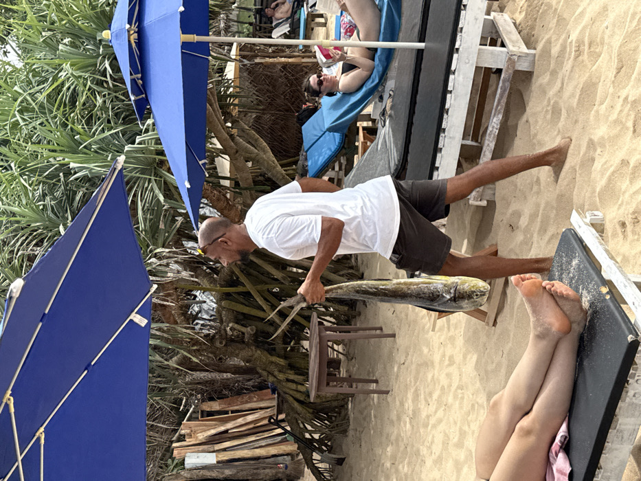 A man in a white t-shirt and dark shorts holds a large fish by the tail on a sandy beach. He is tanned with a shaved head and glasses. Two blue umbrellas are visible. In the background, a woman lies on a beach chair. In the foreground, the lower legs and feet of another person are visible on a black lounge chair. Behind the man is vegetation and wooden planks stacked together.