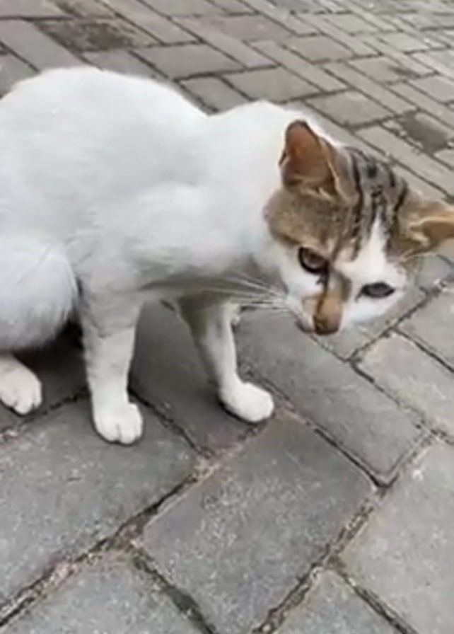 white cat with tabby markings on its head, ears and tail, standing on a gray brick pavement