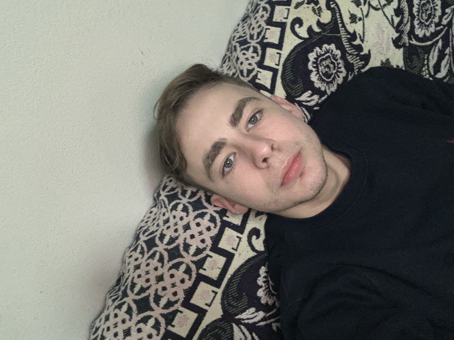 The image presents a single Caucasian male, appearing to be a young adult, with short brown hair, light-colored eyes, and prominent eyebrows