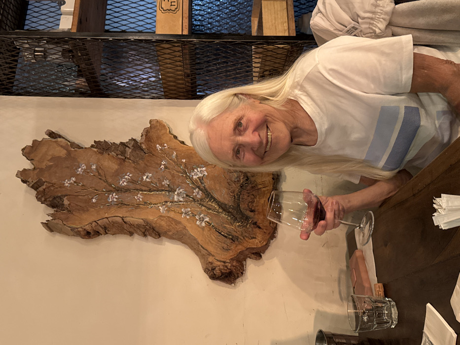 The scene takes place indoors at an establishment in Eilat, Israel. An elderly female subject, estimated to be in her 70s to 80s, is seated at a dark brown wooden table, looking directly at the camera with a broad smile. She has long, straight, silver-white hair extending past her shoulders and wears a white short-sleeved t-shirt featuring three horizontal stripes of light blue and light greyish-blue across the chest. Her right hand holds a stemware glass, approximately half-filled with red liquid, consistent with red wine, raised to eye level. On the table to the subject's left, an empty, clear, textured glass tumbler is visible. A small metallic bucket is partially obscured on the far left. A stack of white paper napkins in a holder rests on the table closer to the foreground. The background features a light-colored wall. Mounted on this wall, to the left and behind the subject, is a large, irregularly shaped piece of light brown wood, resembling a tree burl or cross-section, with painted white and light-colored flowers on thin branches. To the right of the subject, a tall, dark metal shelving unit with a mesh front and multiple shelves displays various items, including bottles and wooden boxes. A light-colored jacket is draped over a chair to the right of the subject, partially visible. The overall lighting is warm.