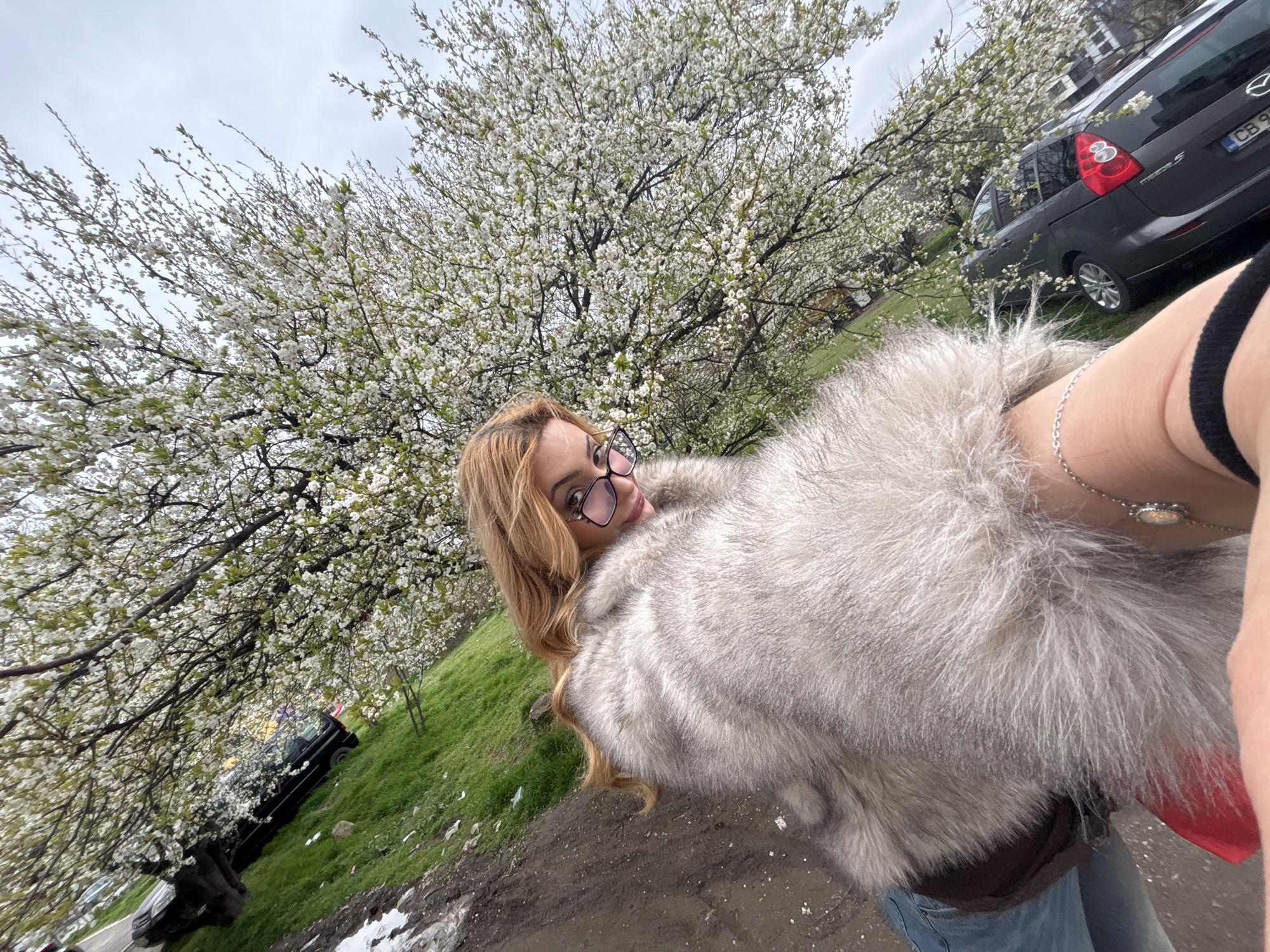 A selfie taken outdoors, in Sofia, Bulgaria. The scene features a woman with blonde curly hair and glasses, wearing a large, light gray faux fur coat. Behind her, a blooming tree covered in white flowers is prominently visible. To the right, a dark gray Mazda minivan with a Bulgarian license plate is parked. In the lower left corner, part of another dark-colored vehicle is also visible. The ground is partially muddy with remnants of melting snow. The sky is overcast.