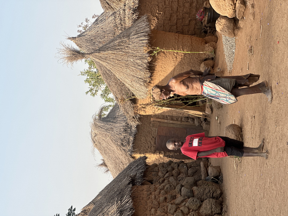 A rural scene shows two people standing outside mud huts with thatched roofs. The boy wears a red Tommy Jeans T-shirt and black shorts. The older man has a cloth tied around his waist and carries a striped bag. The ground is dry and dusty. One of the huts has a visible door, while the roofs are made of straw. A few trees and green vegetation are visible.