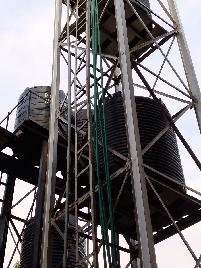A water tower with a steel frame supports stacked, ribbed, black water tanks