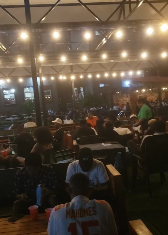 n outdoor covered patio at night, with many people sitting at tables. The patio has a metal frame with a roof, and is decorated with strings of lights. Most people are facing towards a central point, likely a screen or stage. Some people are wearing jerseys with numbers. There are red cups on the tables. The video is taken from a slightly low angle, looking up at the patio.