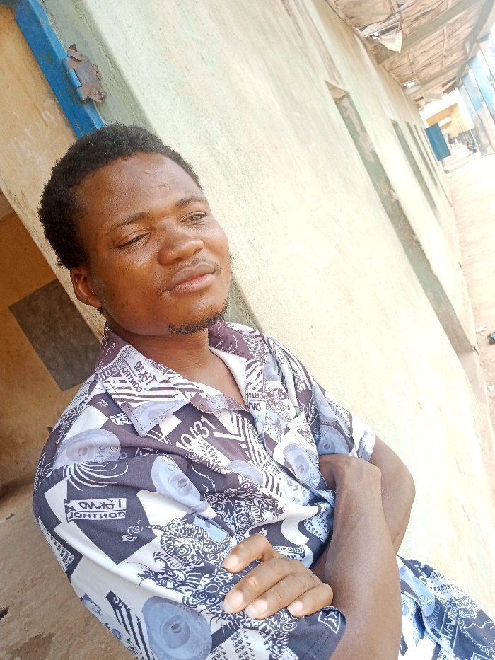 An outdoor photograph, taken at eye level, shows an adult male standing against a textured wall in Akwanga, Nigeria