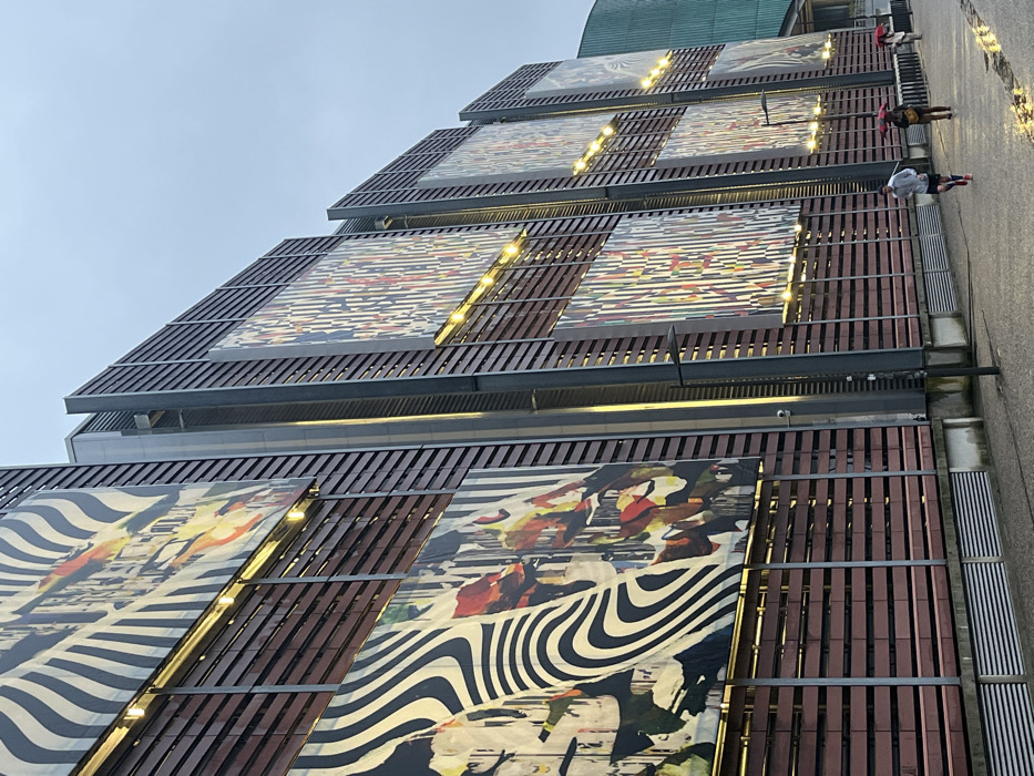 The exterior of a modern building features a multi-tiered facade. Each tier is adorned with artwork or patterned panels set behind a brown wooden slat structure. Strings of lights run vertically between the panels. The building's architecture uses a stepped or terraced design. People can be seen on the topmost tier along a sidewalk. The sky appears overcast.