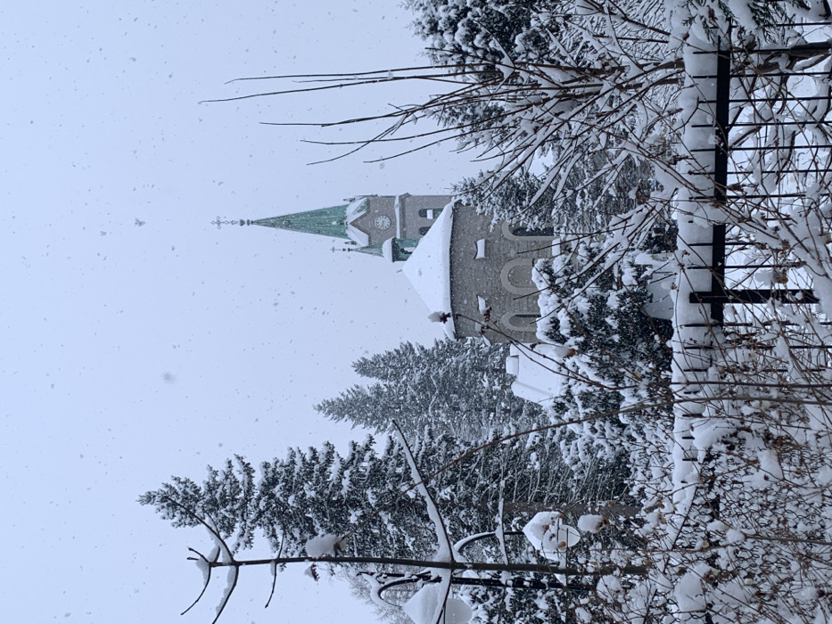 A snow-covered landscape features a church steeple with a clock tower. The church is partially obscured by snow-laden evergreen trees. Bare branches and a snow-dusted metal fence frame the scene on the right. The sky is overcast, and snow is falling, creating a wintery atmosphere.