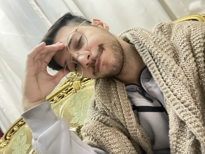 The scene is an indoor location within Sarouja Municipality, Syria. A young adult male is depicted in a close-up, slightly tilted shot. He has short dark hair, a light beard, and a mustache. He wears round, gold-rimmed glasses and a large gold-colored hoop earring with a geometric design in his left ear. The subject is dressed in a beige, chunky-knit open cardigan over a light-grey zippered jacket, which features a horizontal black stripe across the chest. His left hand is positioned with fingers touching his forehead, above his right eye, which is partially closed or squinting. His mouth displays a slight, closed-lip smile. The subject is seated against an ornate gold-colored furniture piece with carved details and light-green patterned upholstery. A light-colored curtain is visible in the upper left background.