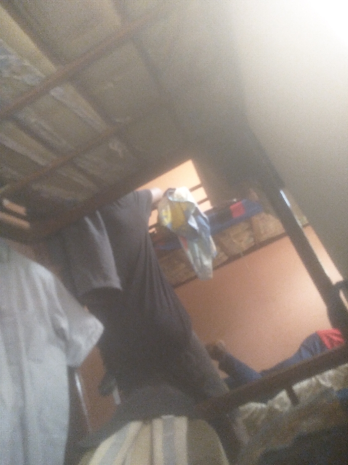 Inside a room, a person appears to be on the top bunk of a bunk bed. The bed frame is visible along with clothes hanging or draped over parts of it. The person is wearing a dark shirt. There's a white shirt visible on the left side. The walls of the room are a muted orange color. The lighting is poor, and the photo has a blurry, tilted perspective.