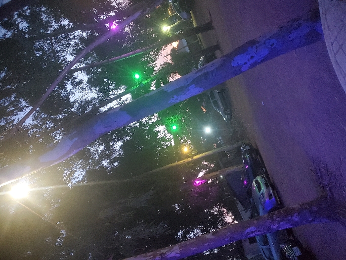 A night scene features trees adorned with string lights of varying colors, including green, purple, and white. The lights illuminate the branches and create a festive atmosphere. Cars are parked along a path illuminated by these lights. The overall effect is a blend of natural elements and artificial lighting, creating a vibrant nighttime environment. The image is rotated counterclockwise.
