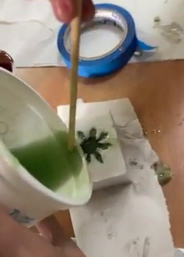 A person in a gray sweater and blue baseball cap carefully pours a green liquid from a white cup into a small, square mold on a table covered with a white paper towel. The mold appears to have a dark green, plant-like shape inside. A wooden stick is used to stir the liquid within the cup. A roll of blue tape and a small bottle are visible on the table, along with scattered droplets of the same green liquid. A second person is seated in the background.