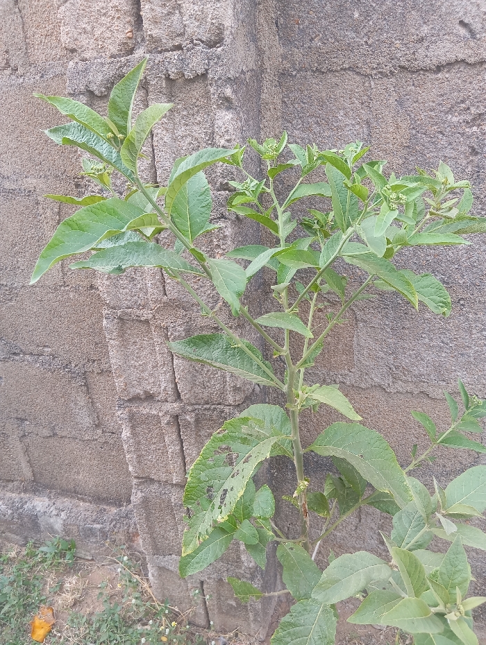 The image displays a green herbaceous plant or small shrub, approximately 1 to 1.5 meters tall, positioned against a grey concrete block wall. The plant features numerous ovate to lanceolate green leaves, some of which exhibit insect damage, indicated by small holes and discolored areas, predominantly on the lower leaves. Clusters of undeveloped light green floral buds are visible at the branch tips. The main stem is robust and brownish-green. The background consists of a rough-textured, weathered grey concrete block wall, showing distinct block divisions and surface variations. The ground in the lower left foreground is visible as sparse soil with minimal green vegetation and one indistinct yellow-orange organic object. The scene is outdoors, located in Makurdi, Nigeria.