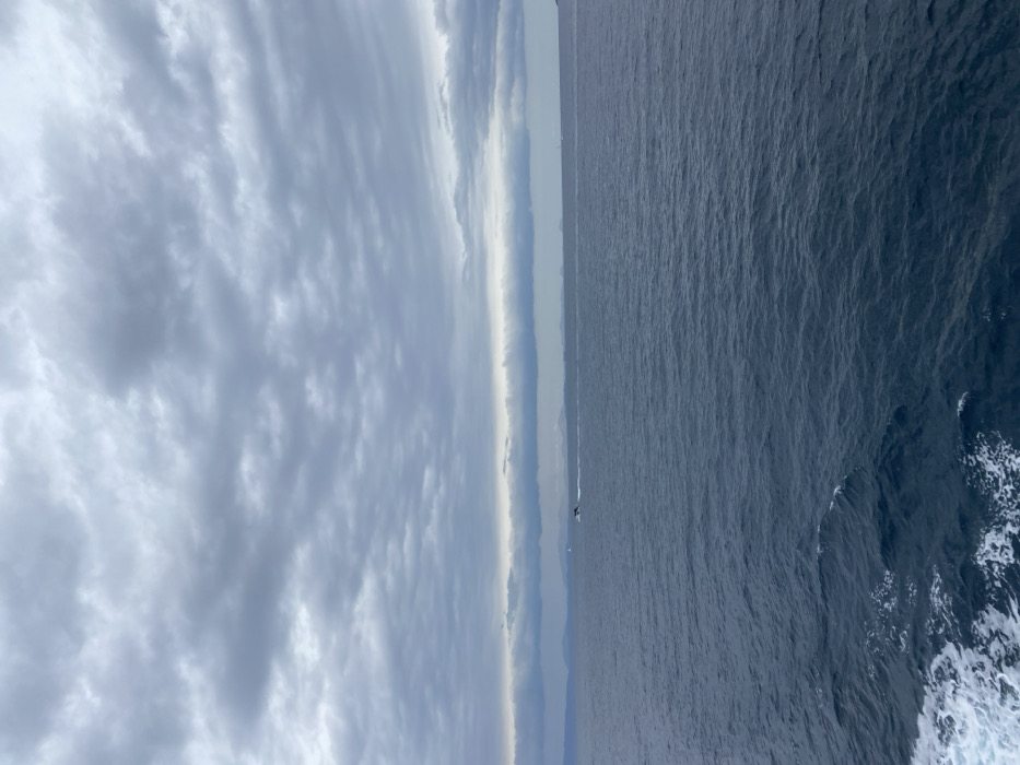 The image captures an expansive view of a sea under an overcast sky, observed from a coastal region in Greece, the specific city being unknown. The sky, occupying the upper third of the frame, is covered by a dense formation of gray altocumulus clouds, presenting a mottled appearance. The lower two-thirds of the image consists of dark blue-gray sea water with visible surface ripples and minor waves. In the immediate foreground, a white foamy wake indicates the presence and movement of the vessel from which the photograph was taken. In the mid-ground, slightly to the left of the center, a dark-colored personal watercraft, identified as a jet ski, is actively in motion, creating a substantial white spray and wake behind it as it traverses a wave. Further to the left and more distant, a small white sailboat is discernible by its mast and sail. Along the distant horizon, a series of low-lying, dark landmasses are visible, silhouetted against a lighter band of sky, indicative of distant islands or a coastline. No explicit human figures are visible, although the operation of the jet ski implies human presence.