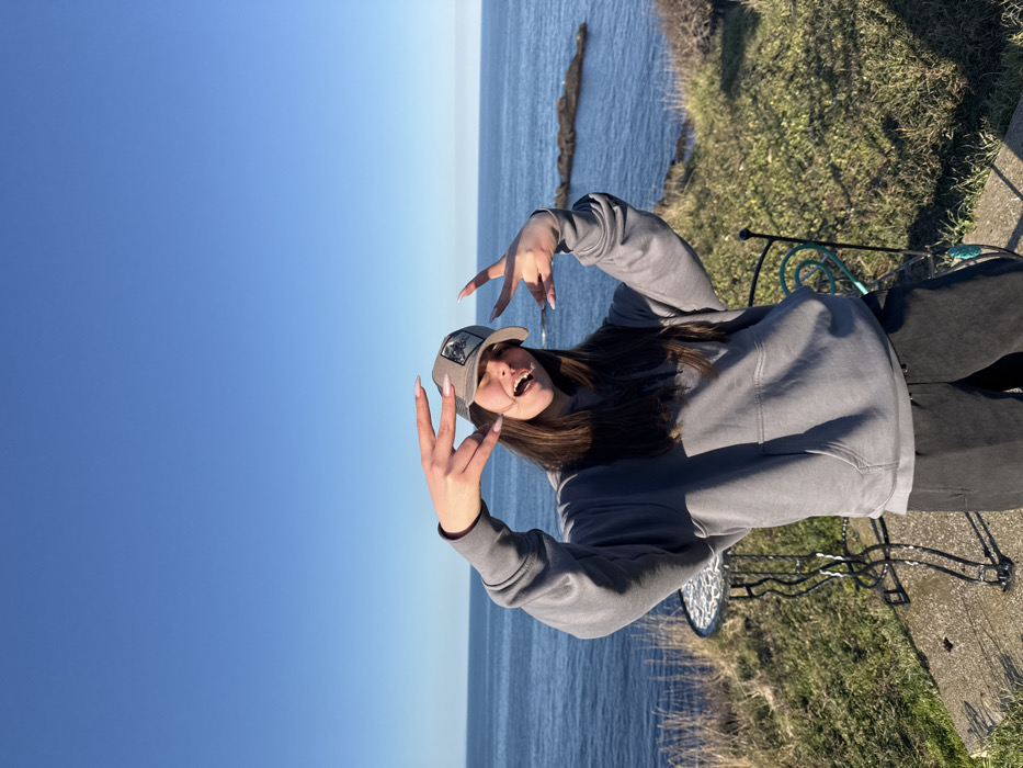 A young female stands centrally in an outdoor, daylight scene in Varvara, Bulgaria, positioned on a grassy clifftop overlooking the Black Sea. She wears a grey baseball cap with a dark emblem, a grey hooded sweatshirt, and dark trousers. Her mouth is open, and both hands are raised to shoulder height with fingers extended. Her right hand shows an extended thumb, index, and pinky finger, while her left hand displays extended index and middle fingers, forming a 'V' shape. Long, light-colored fingernails are visible on both hands. Behind her, the calm, dark blue sea stretches to meet a clear, bright blue sky at the horizon. Dark rock formations are visible in the water offshore to her right. To her immediate left, a wrought iron table with a mosaic-patterned top is partially visible on a concrete slab. A portion of a decorative wrought iron chair with teal accents is visible to her immediate right. The ground in the foreground consists of sparse green grass and concrete paving.